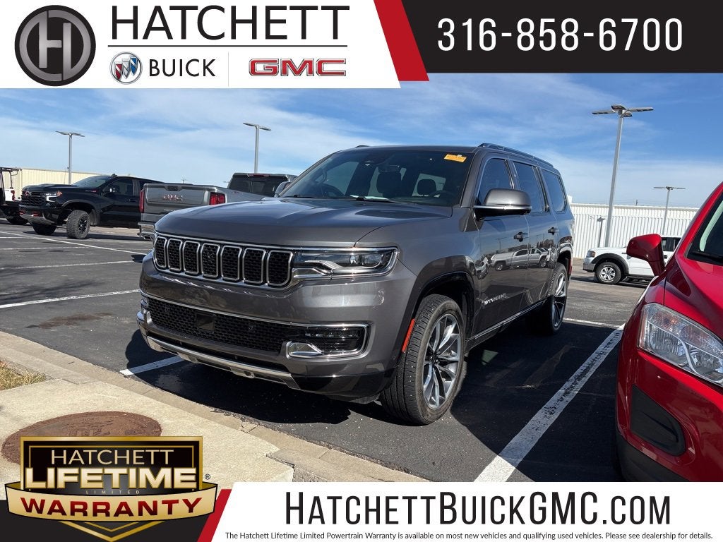 2022 Jeep Wagoneer Series III Baltic Gray Metallic Clearcoat 8-Speed Automatic For sale at Hatchett Buick GMC in Wichita Kansas. ** Multi Point Inspection and all Necessary Maintenance & Reconditioning Items are Performed to Strict Hatchett Standards** Complete Detail of Interior and Exterior. Odometer is 9303 miles below market average! ** No Accidents, ** One Owner, ** Local Trade-In, ** Backup Camera, ** Bluetooth® Connectivity, ** Apple CarPlay/Android Auto, ** Wireless Phone Charging, ** Automatic Headlights, ** Power Drivers Seat, ** Power Passenger Seat, ** Heated Front Seats, ** Heated Steering Wheel, ** Cooled Front Seats, ** Heated Rear Seats, ** Memory Package, ** Remote Vehicle Start, ** Sirius XM Capable, ** Sunroof/Moonroof, ** Trailering Package, ** Front/Rear Park Assist, ** Forward Collision Alert, ** Rear Cross Traffic Alert, ** Lane Keep Assist w/Lane Departure Warning, ** Lane Change/Side Blind Zone Alert, ** Front Pedestrian Braking, ** HD Surround Vision, ** Adaptive Cruise Control, ** On Star Services and 4G WI-FI, ** Infotainment System w/Navigation, ** Auto Locking Rear Differential, ** Programmable Hands-Free Liftgate, 19 Speaker McIntosh Audio System, 2nd Row Manual Window Shades, 3 Panel Sunroof, 7-Passenger Seating, Adjustable Roof Rail Crossbars, Amazon Fire TV Built-In, Cargo Cover, Convenience Group I, Drowsy Driver Detection, Flexible Seating Group, Floor Console w/Cupholder, Intersection Collision Assist System, Luxury Front & Rear Floor Mats, Navigation System, P&P Park & Unpark Assist w/Stop System, Power Deployable Running Boards, Power Tip/Slide Recline 2nd Row Buckets, Premium Group I (DISC), Quick Order Package 22N, Rear Seat Video Group 1, Reversible Carpet/Vinyl Cargo Mat, Seatback Video Screens, Surround View Camera System, Traffic Sign Recognition, Video USB Port.