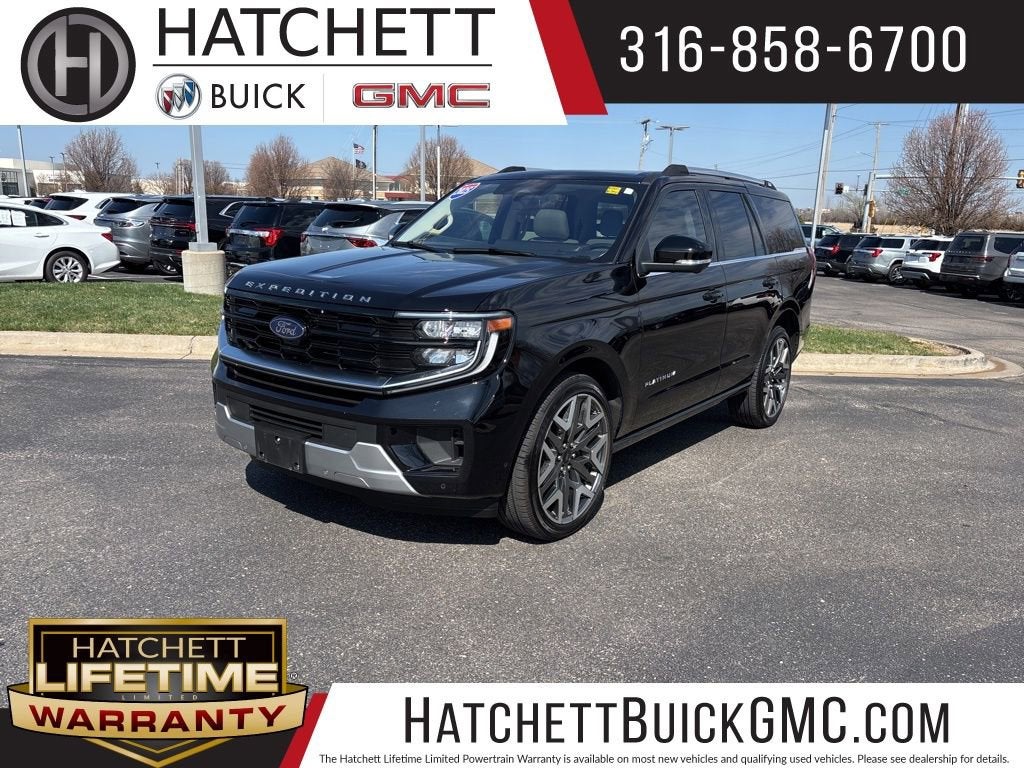 2025 Ford Expedition Platinum Black Metallic 10-Speed Automatic For sale at Hatchett Buick GMC in Wichita Kansas. ** Multi Point Inspection and all Necessary Maintenance & Reconditioning Items are Performed to Strict Hatchett Standards** Complete Detail of Interior and Exterior. Odometer is 3875 miles below market average! ** Lifetime Warranty, ** No Accidents, ** One Owner, ** Local Trade-In, ** Bluetooth® Connectivity, ** Wireless Phone Charging, ** Automatic Headlights, ** Power Drivers Seat, ** Power Passenger Seat, ** Heated Front Seats, ** Cooled Front Seats, ** Heated Rear Seats, ** Memory Package, ** Sirius XM Capable, ** Sunroof/Moonroof, ** Trailering Package, ** Forward Collision Alert, ** Adaptive Cruise Control, 4WD, 2nd Row Power-Folding Captain's Chairs, Black Headlamp Bezel w/Satin Trim Applique, BlueCruise Equipped (1-Year Plan), Carbon Black Front Bumper w/Lit Grille Bar, Continuous Control Damping Suspension, Driver's Package, Engine Sound Enhancer, Equipment Group 600A Standard Package, Front Door Scuff Plates w/Met Insert & Bright Rear, High Flow Exhaust System, Multicontour Active Motion Lthr Frnt Captains Chairs, Navigation System, Platinum Ultimate Interior Package, Platinum Ultimate Package, Polished Stainless Steel Beltline Molding, Radio: B&O Unleashed Sound System by Bang & Olufsen, Rear Seat Radio Controls, Rear Side Windows Laminated Glass, Satin Aluminum Expedition Lettering On Side & Hood, Satin Aluminum Platinum Badge On Tailgate, Signature Grille Lighting, SiriusXM w/360L.